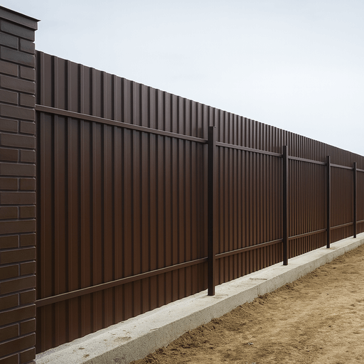 Для установки забора из профнастила под ключ применяются металлические столбы, которые бетонируются в грунт на глубину 0,8–1,2 м. Правильная установка и выравнивание по уровню — залог прочности всей конструкции. -